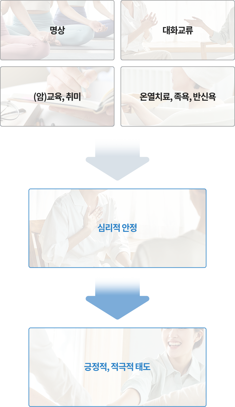 암환자가 되었다는 것은 인생에서 큰 변화가 시작된 것을 의미합니다. 암환자에게 심리치료는 암을 이해하고, 자신의 입장을 이해하는 매우 중요한 시도이며, 이런 과정을 통해 암 치료에 좋은 효과를 얻을 수 있고 생존율 상승을 기대할 수 있으며 결과적으로 암을 극복하는 계기가 될 수 있습니다.