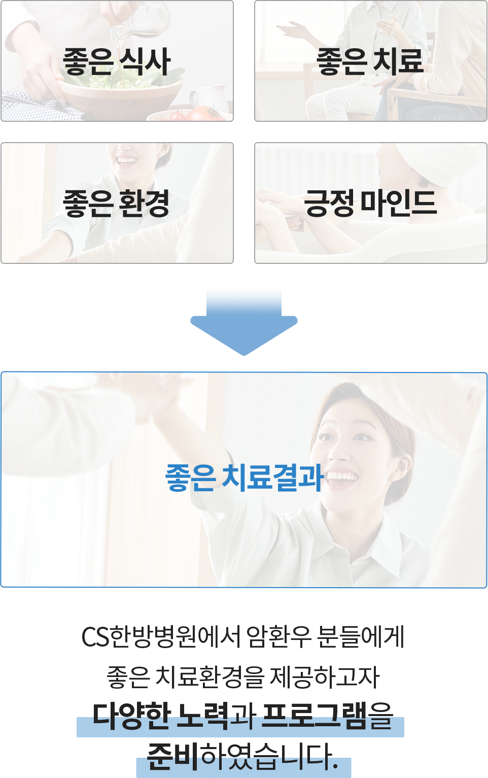 아쉽게도 많은 암 환자들이 표준치료만으로 암을 극복하지 못하는 경우가 많습니다. 저희 CS한방병원에서는 한의학과 서양의학의 결합을 통한 통합암치료를 실시하여 표준치료의 한계를 보완하려고 합니다.