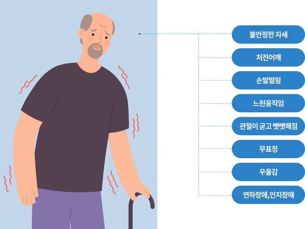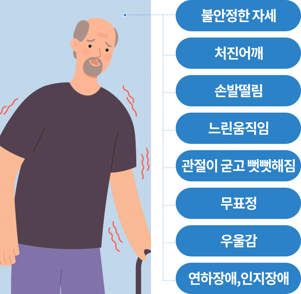 - 느려진 행동, 다리를 끌며 걸음 얼굴표정도 없어짐
